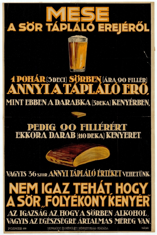 A Munkaügyi és Népjóléti Népbiztosság alkoholellenes propaganda plakátja. „1 pohár (3 deci) sörben (ára 90 fillér) annyi a tápláló erő, mint ebben a darabka (3 deka) kenyérben. Pedig 90 fillérért ekkora darab (110 deka) kenyeret, vagyis 36-szor annyi tápláló értéket vehetünk. Nem igaz tehát, hogy a sör „folyékony kenyér". Az igazság az, hogy a sörben alkohol, vagyis az egészségre ártalmas méreg van."