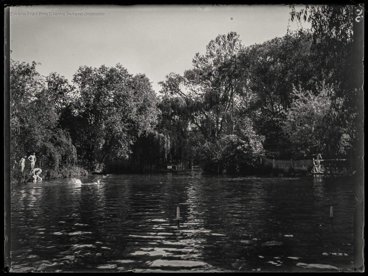 tó, víz, külső felvétel, fürdőzés, ember, növényzet, fa, kerítés, nyár