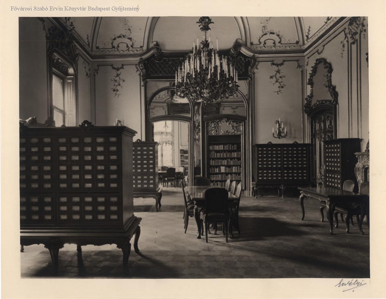 könyvtár, neobarokk, lámpa, könyvtári katalógus, belső felvétel, bútor