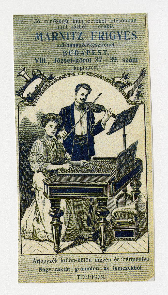 hegedű, trombita, dob, cimbalom, zenész, zene, nő, férfi, kotta, lant, gramofon, lemez, lemezjátszó, üzlet, reklámnyomtatvány, kisnyomtatvány, aprónyomtatvány, számolócédula