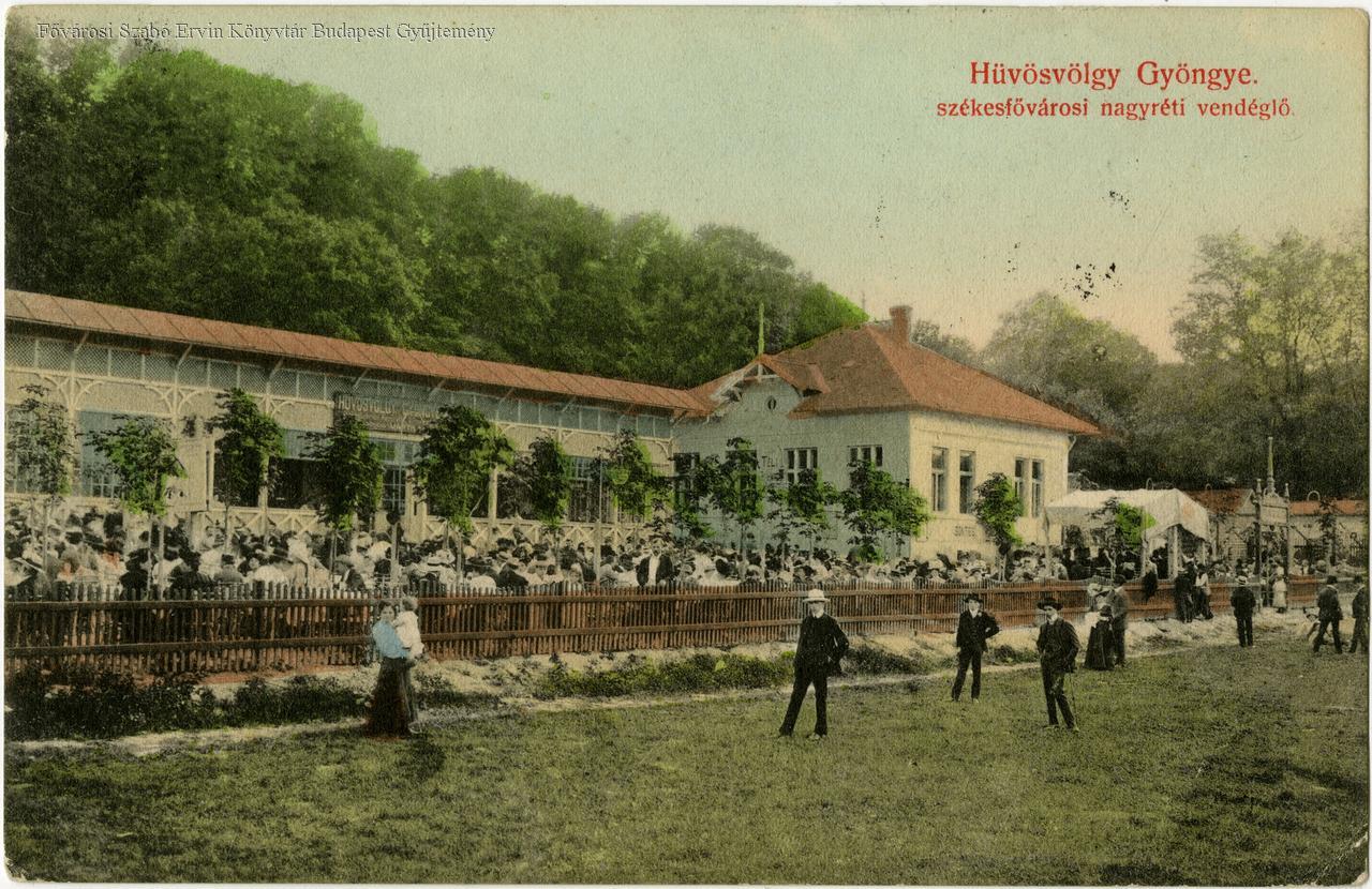 képes levelezőlap, étterem, vendéglátás, külső felvétel, kert, kerthelyiség, gyep, 1910 körül