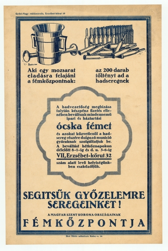 "Aki egy mozsarat eladásra felajánl a fémközpontnak: az 200 darab töltényt ad a hadseregnek", "A hadvezetőség megbízása folytán készpénz fizetés ellenében beváltunk mindennemű ipari és háztartási ócska fémet és azokat közvetlenül a hadsereg részére dolgozó muníció gyáraknak szolgáltatjuk be. A beváltást hétköznapokon délelőtt 8-1-ig és d. u. 3-6-ig VII, Erzsébet-körút 32 szám alatt levő helyiségünkben eszközöljük. Segitsük győzelemre seregeinket!"