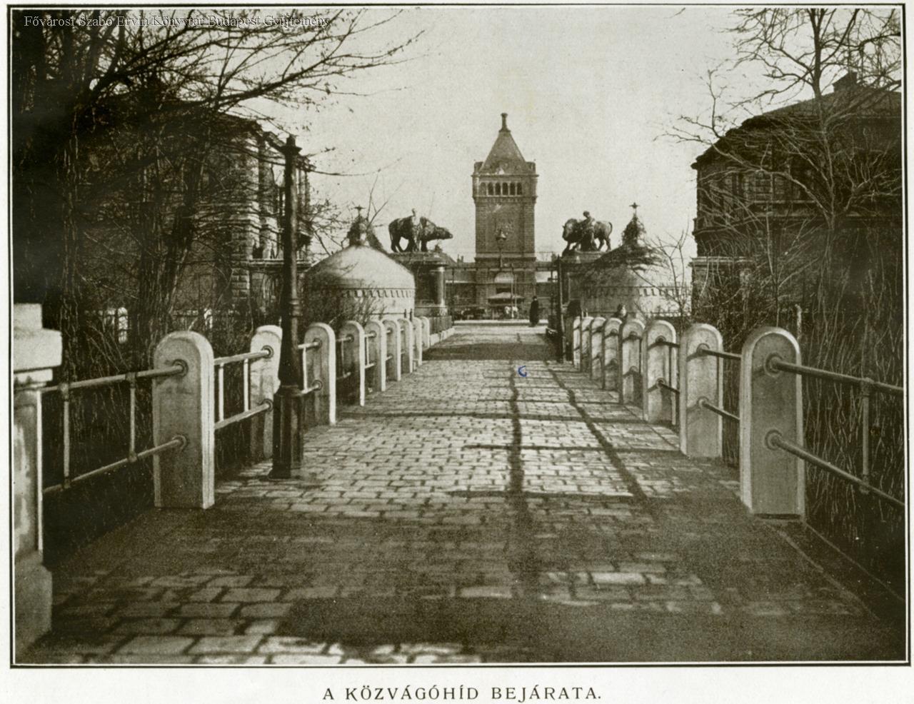 A közvágóhid bejárata Az előtérben a kútház kupolái, a főkapu, az igazgatósági és intézőségi épületek; a háttérben a víztorony