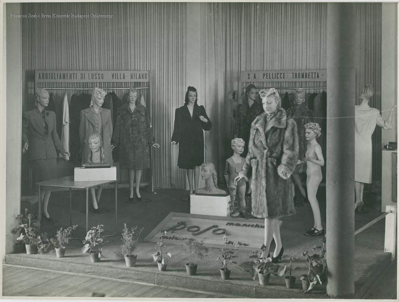 kiállítás, nemzetközi kereskedelem, magyar-olasz kapcsolatok, vásár, árubemutató, pavilon, divat, öltözködés, női ruházat, kosztűm, kabát, szőrmebunda, próbababa, olaszok, belső felvétel, 1941, két világháború közötti időszak