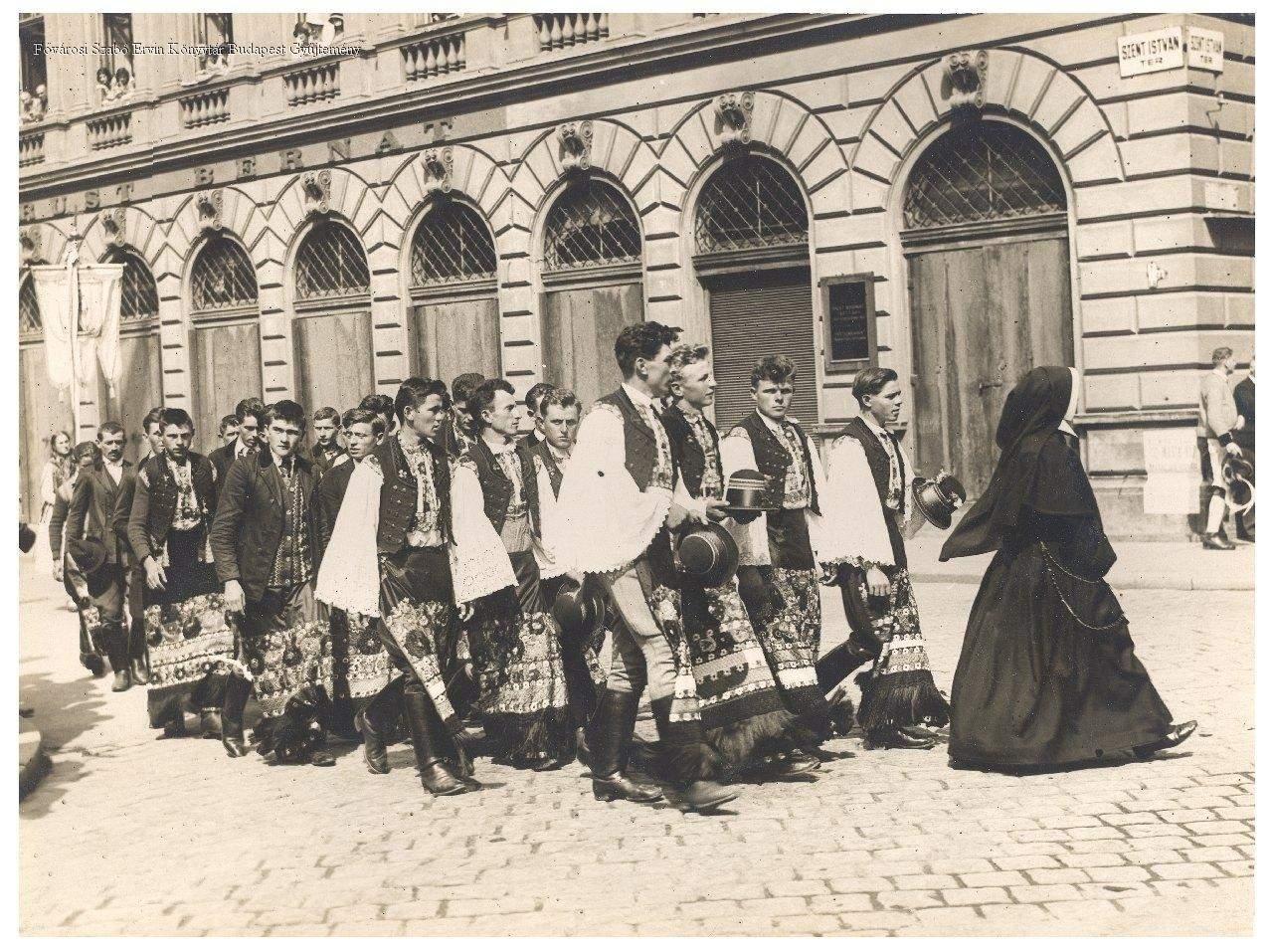 körmenet, katolikus egyház, történeti évforduló, szentek kultusza, keresztény ünnep, augusztus 20., felvonulás, matyók, ünneplő ruha, apáca (szerzetes), zászló, 1930, Horthy-korszak, sajtófotó