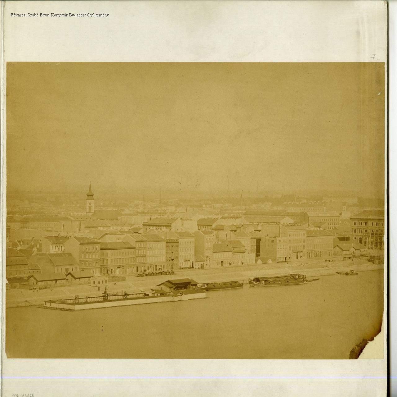 A pesti oldal lakóépületei, balra a Kálvin téri református templom tornya. A rakpart mellett dunai uszoda, a vizen hajók várakoznak. Jobb szélen a Vámház (ma Fővám) tér