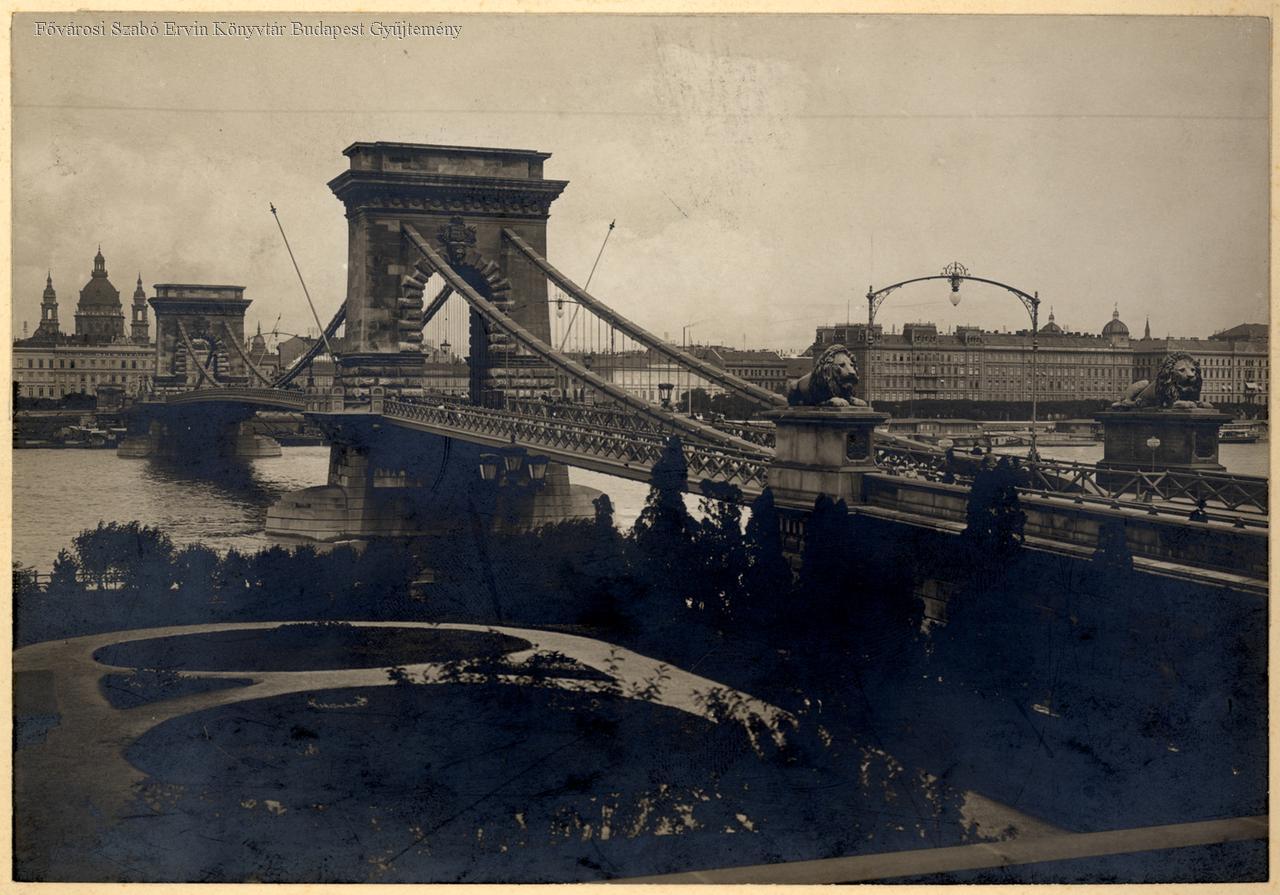 Felvétel a Clark Ádám tér irányából. Előtérben Pecz Ármin-tervezte parkosított terület. A hídon díszes lámpa, zászlótartók. A pesti oldalon a Bazilika és a Duna-korzó házsora