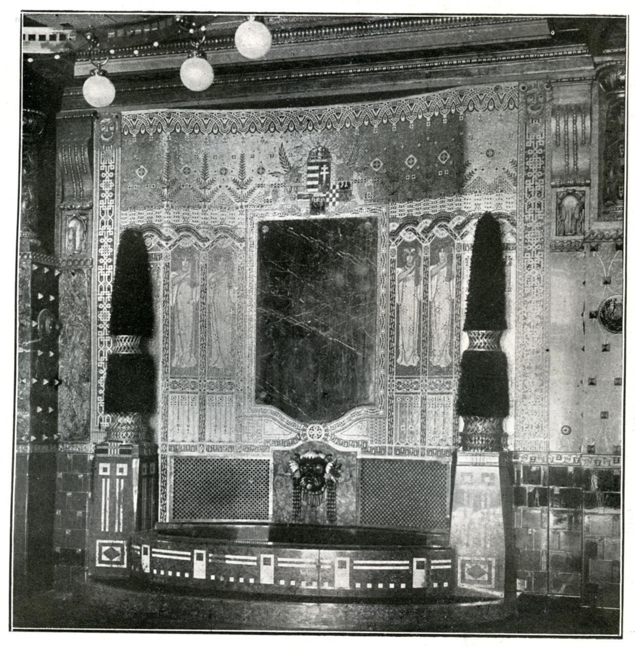 főiskola, egyetem, felsőfokú zeneoktatási intézmény, lámpa, díszkút, üvegművészet, előcsarnok, hangversenyterem, belső felvétel, 1907