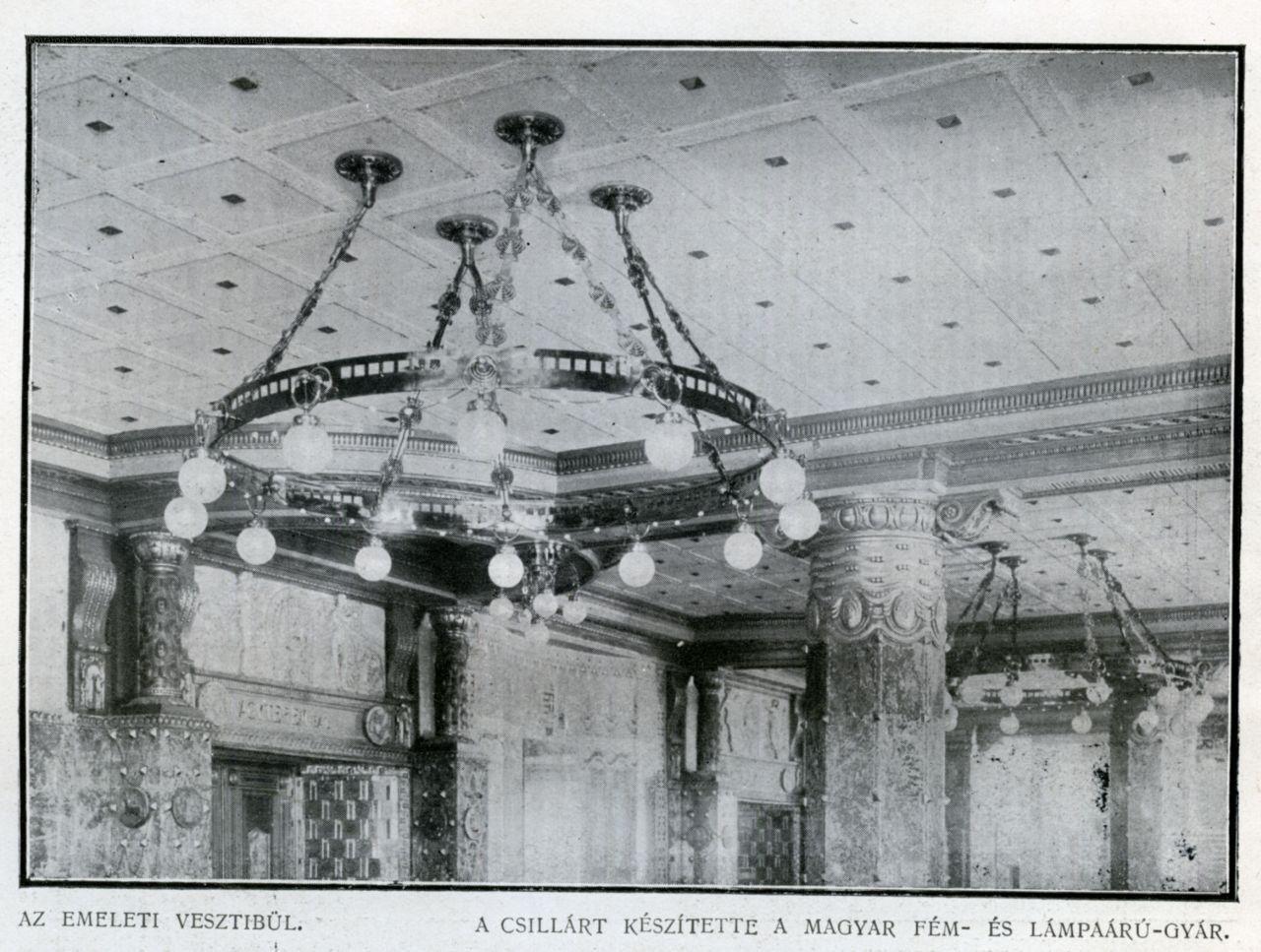 Az emeleti vesztibül, csillár. Készítette a Magyar Fém- és Lámpaárugyár