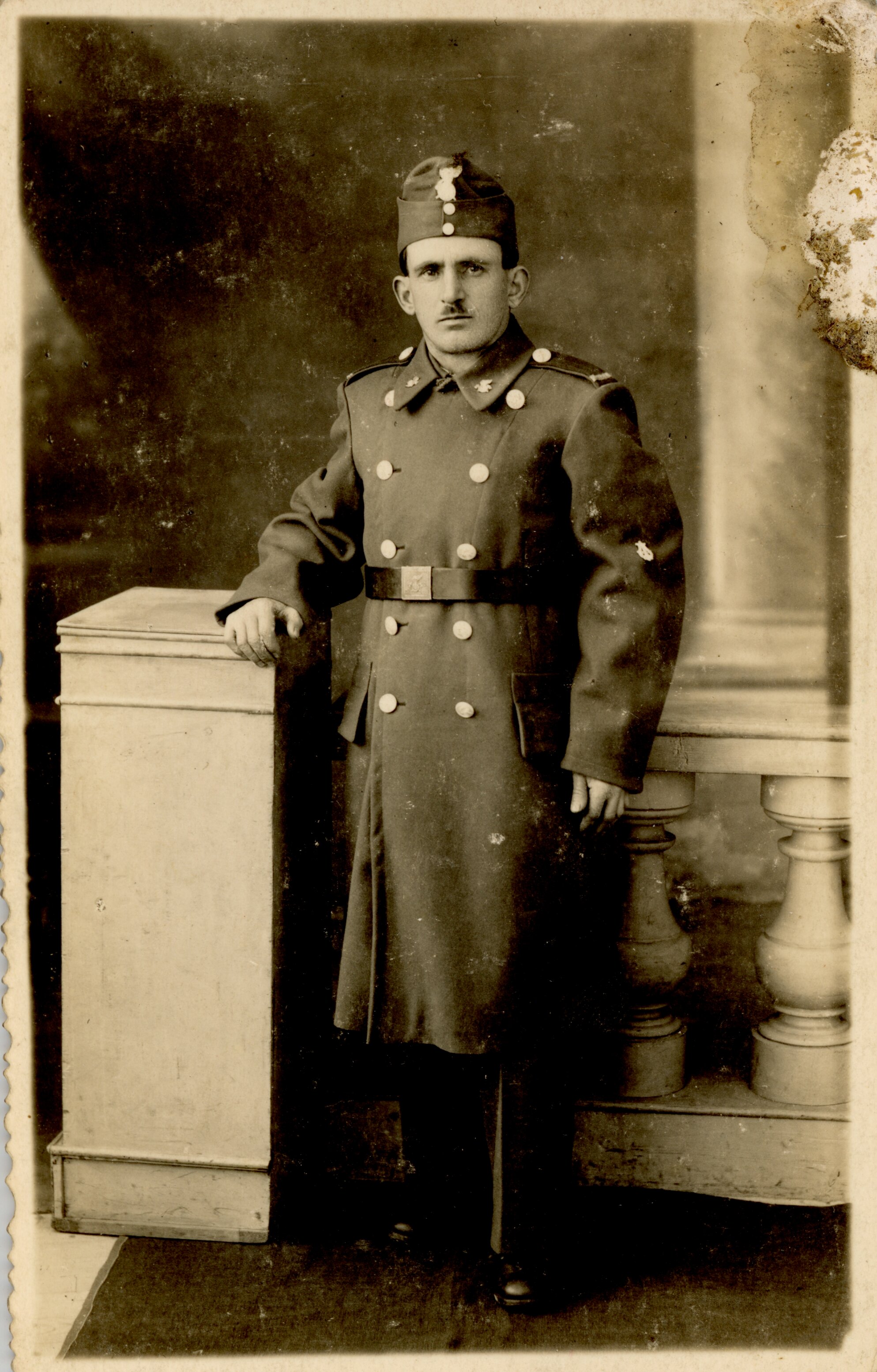 Bevonuló katona egészalakos felvétele 1943-ból; Stúdiófotó festett háttérrel és oszlopos kőkerítéssel.