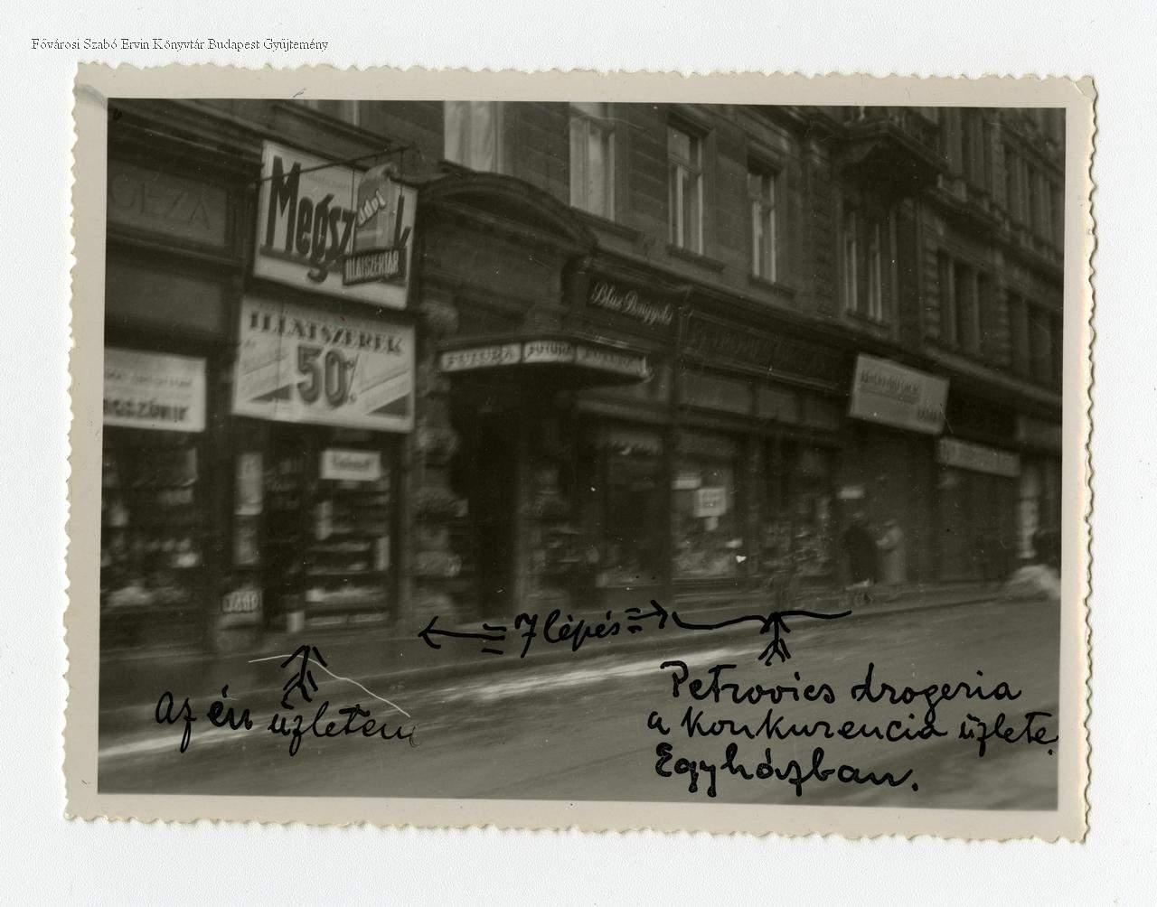 A fényképen utólag tollal ráírt magyarázat: "Az én üzletem / 7 lépés / Petrovics drogéria, a konkurencia üzlete. Egy házban."