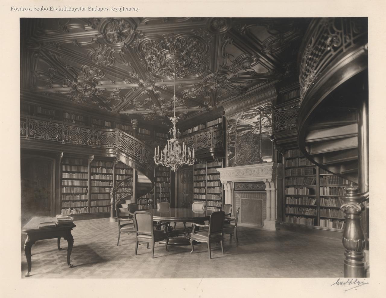 könyvtár, neobarokk, belső felvétel, tükör, könyvespolc, bútor, lépcső, kandalló, ülőbútor