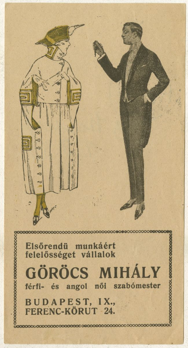 öltözet, ruházati cikk, alkalmi ruházat, divatáruház, felsőruházat, öltözködés, szabó, nő, férfi, szabászat, minőség, reklámnyomtatvány, kisnyomtatvány, aprónyomtatvány, számolócédula