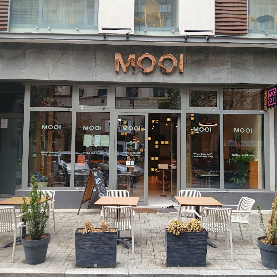 Teljesen elbontott régi épület helyén modern szállodaépület, a földszinten MOOI cafe.