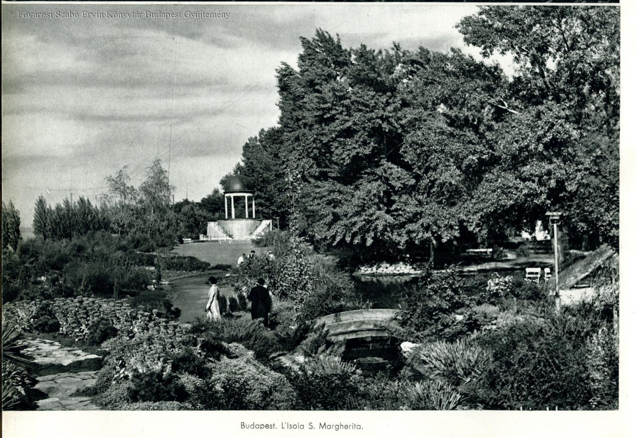 A Bodor kút és környéke, előtérben részlet a japánkertből. Ohmann Béla műve, 1936-ból