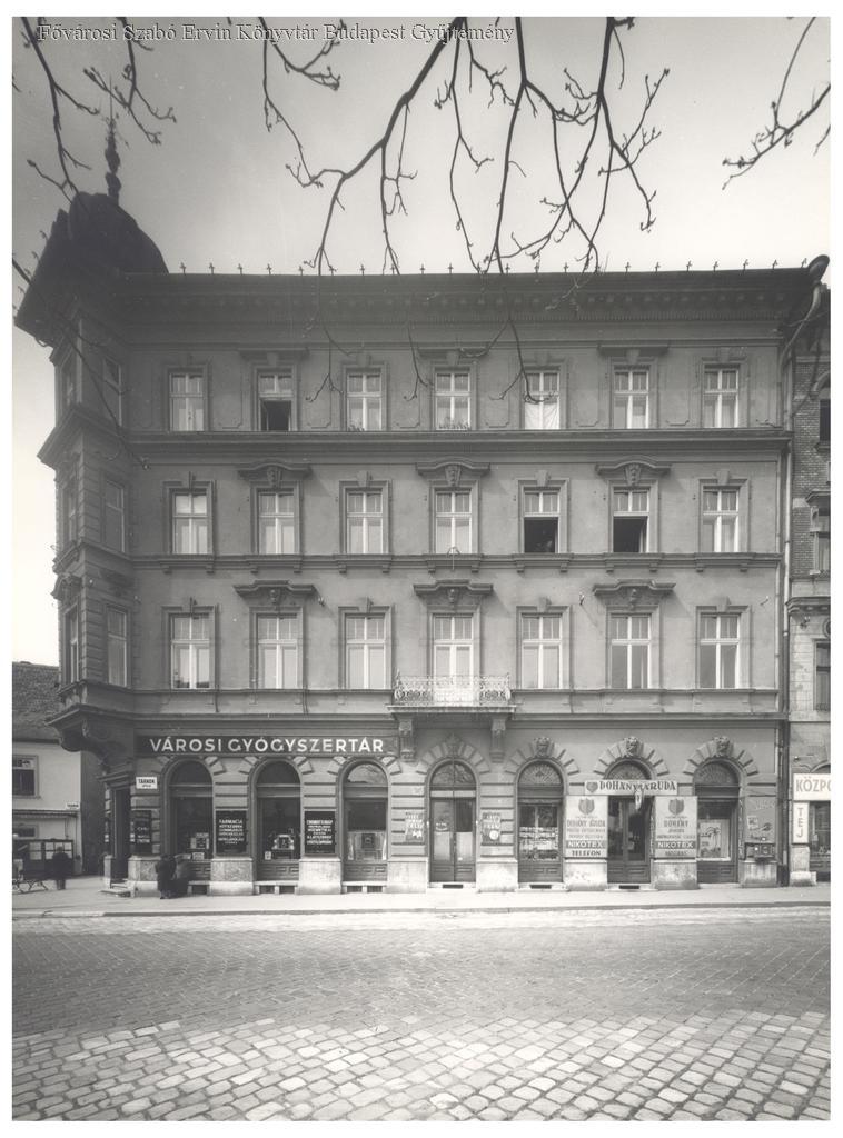 lakóépület, üzlet, trafik, gyógyszertár, kirakat, erkély, épületdíszítés, homlokzat, épületkép, külső felvétel, 1941