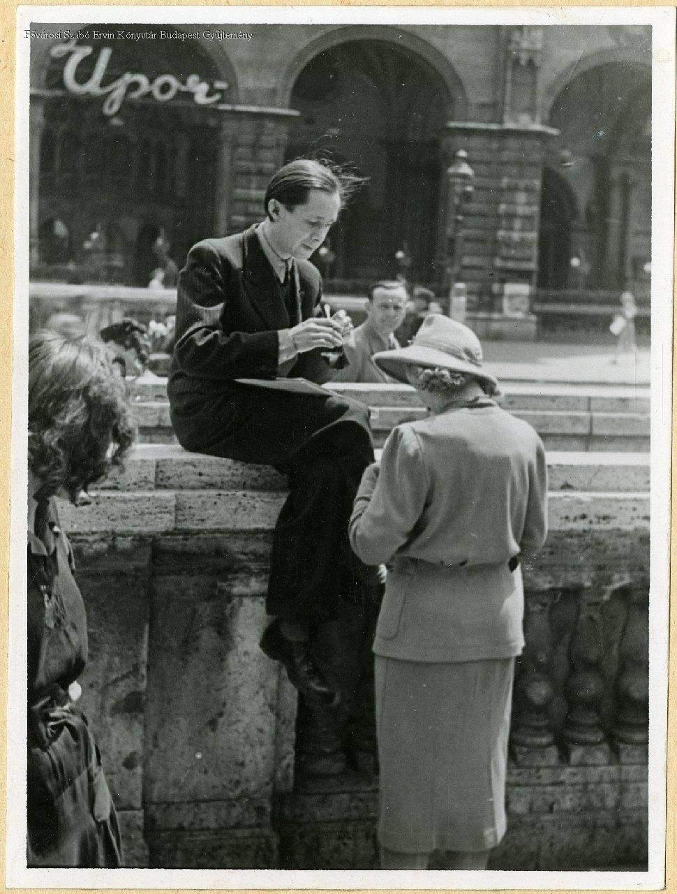 Hincz Gyula festő-grafikus az Operaház előtt az 1942-es könyvnap (június 13.) alatt a korabeli híradás szerint "rajzolja az Új Idők sátrának mozgalmas, színes életét".