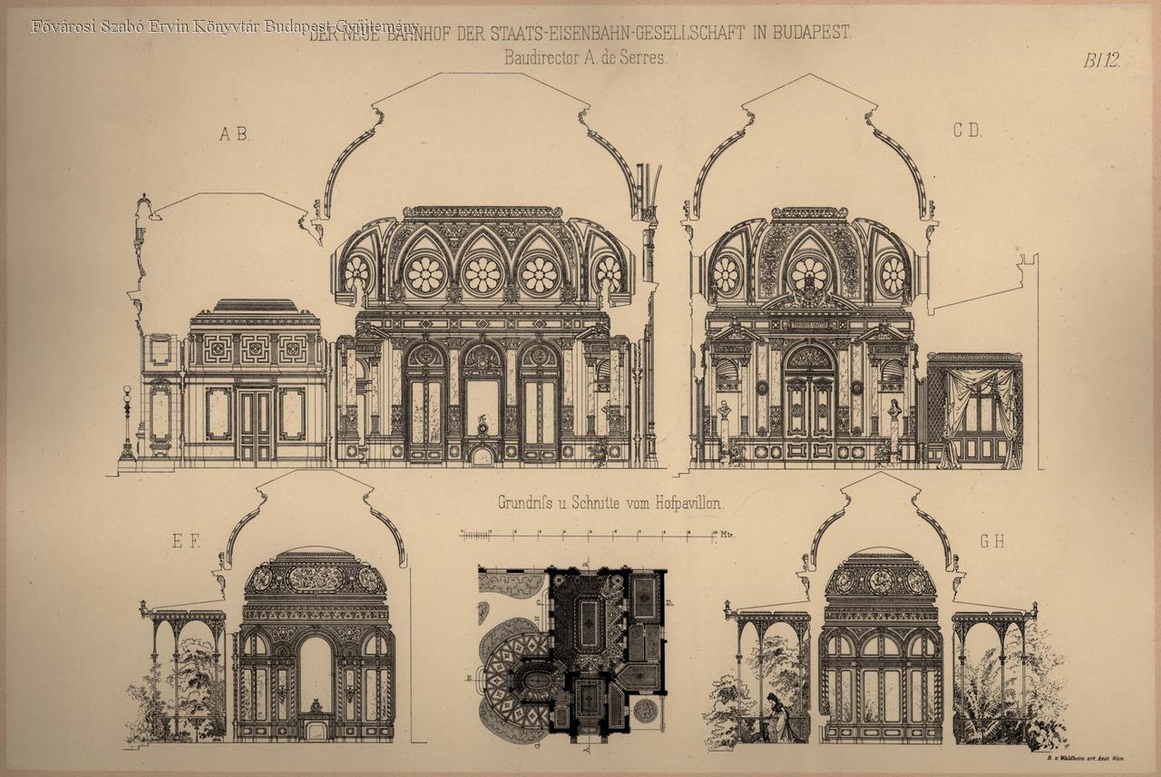Der neue Bahnhof der Staats-eisenbahn Gesellschaft in Budapest : Baudirector A. de Serres Grundriss u. Schnitte vom Hofpavillon /