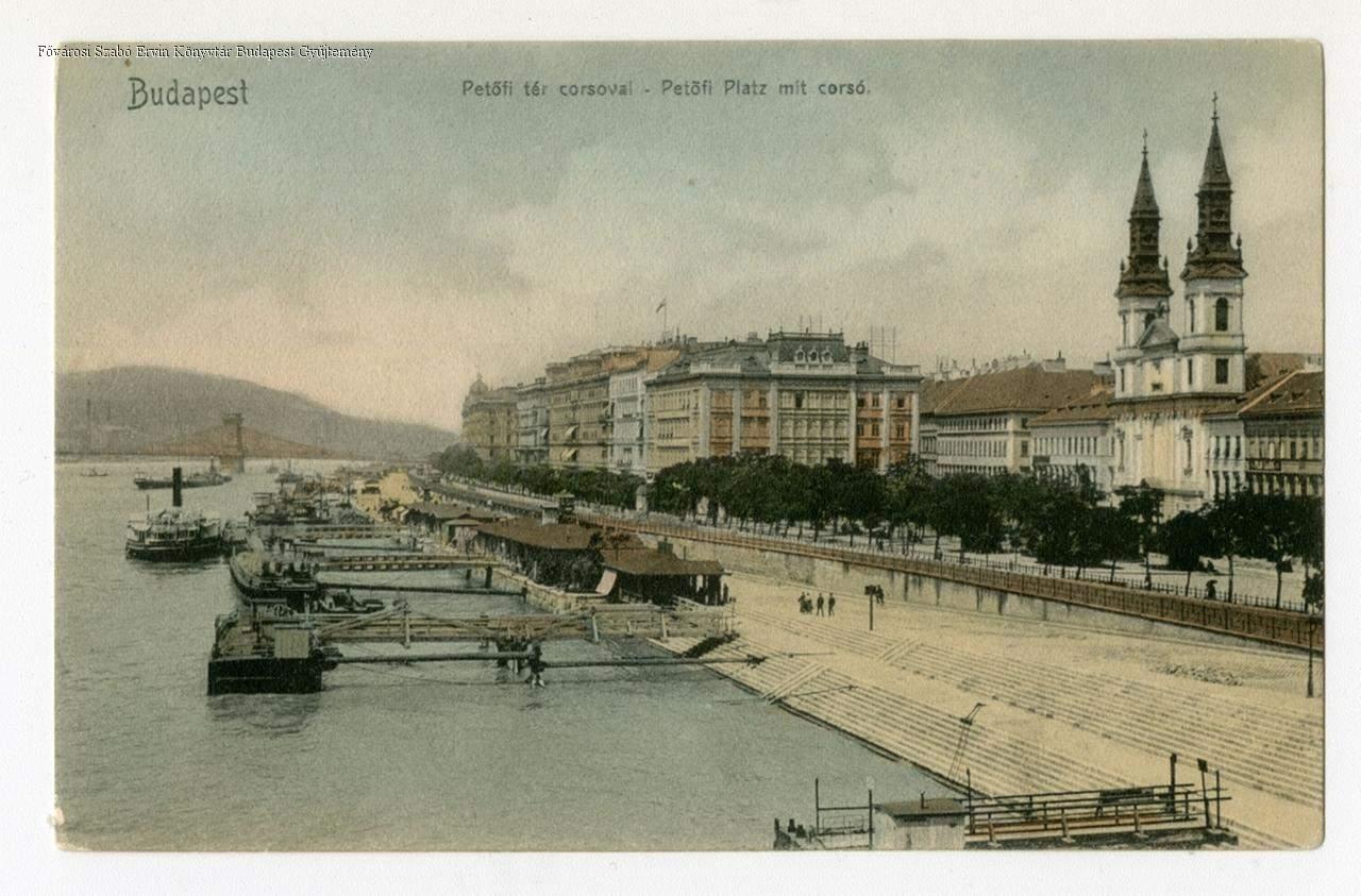 A Duna-korzó és a Petőfi tér, szemben a Bristol Szálló, jobbra az Istenszülő elhunyta templom