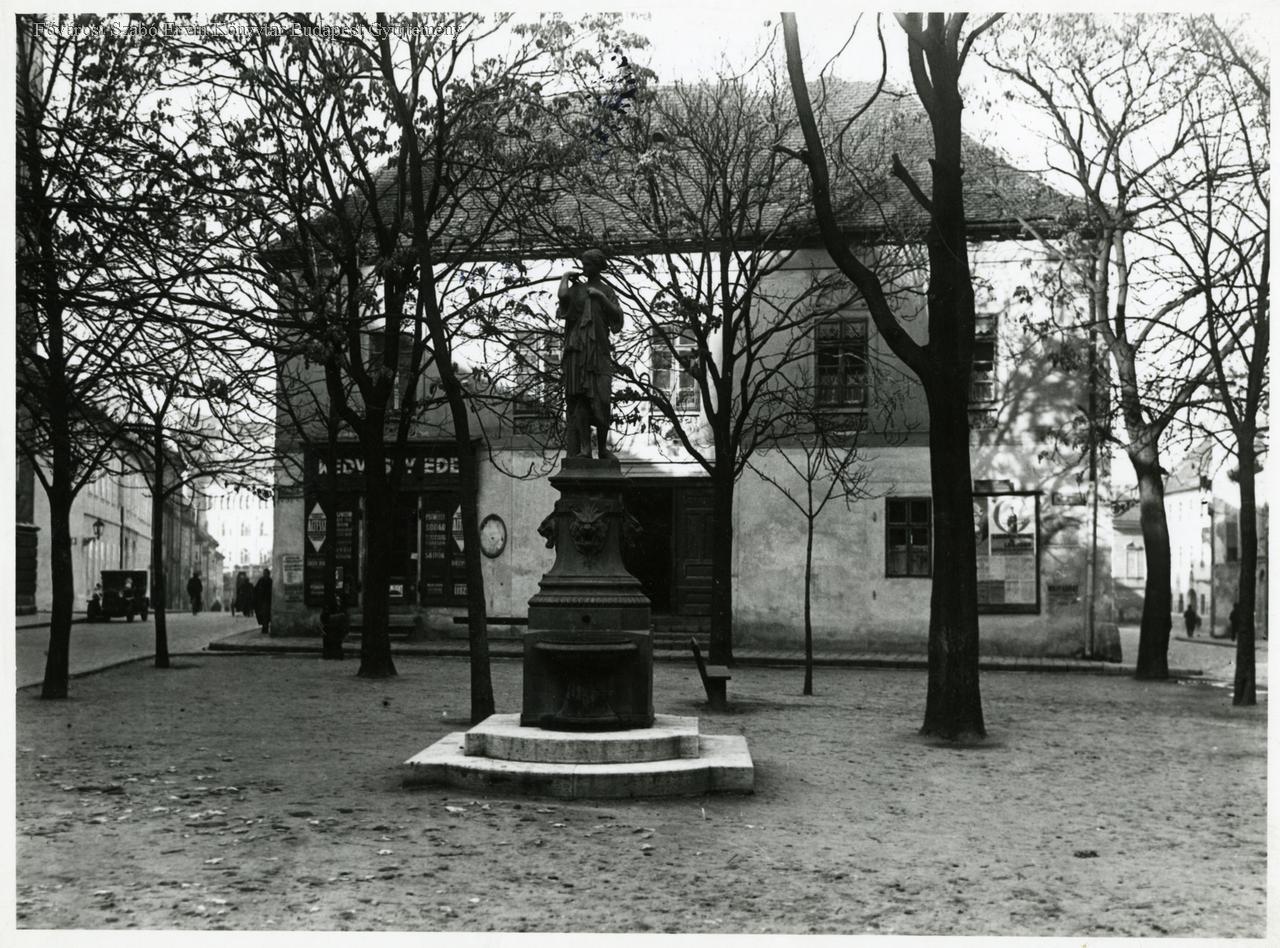[Hébe-kút a Hess András téren, mögötte a Hess András tér 3. sz. egykori Vörös Sün ház]