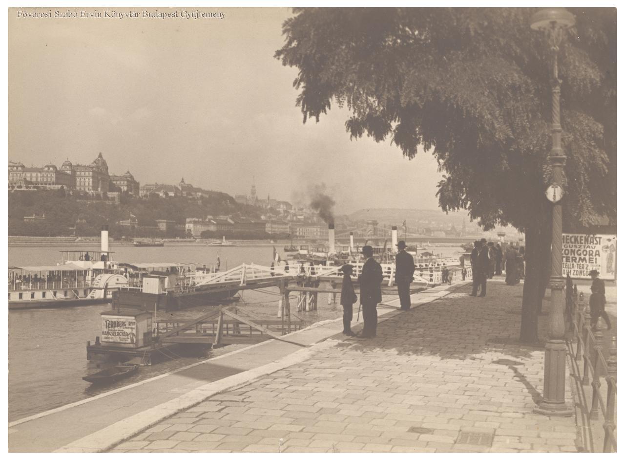 [Pesti Dunapart hajókkal és a korzó részletével]