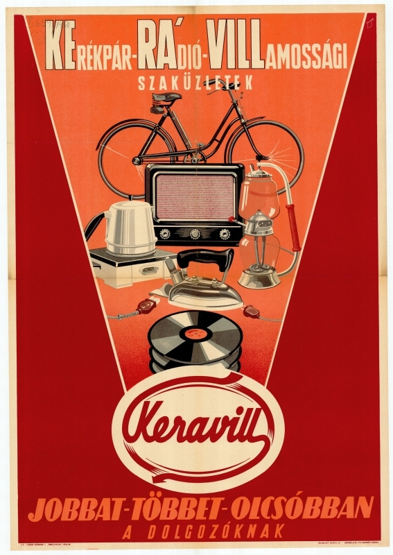 Keravill hirdetménye. A plakát színes, alul és felül szöveges információkkal. A kép közepén egy bicikli, egy egy rádió, egy vasaló, egy kávéfőző, illetve hanglemezek láthatók, bemutatva, hogy miket árulnak.