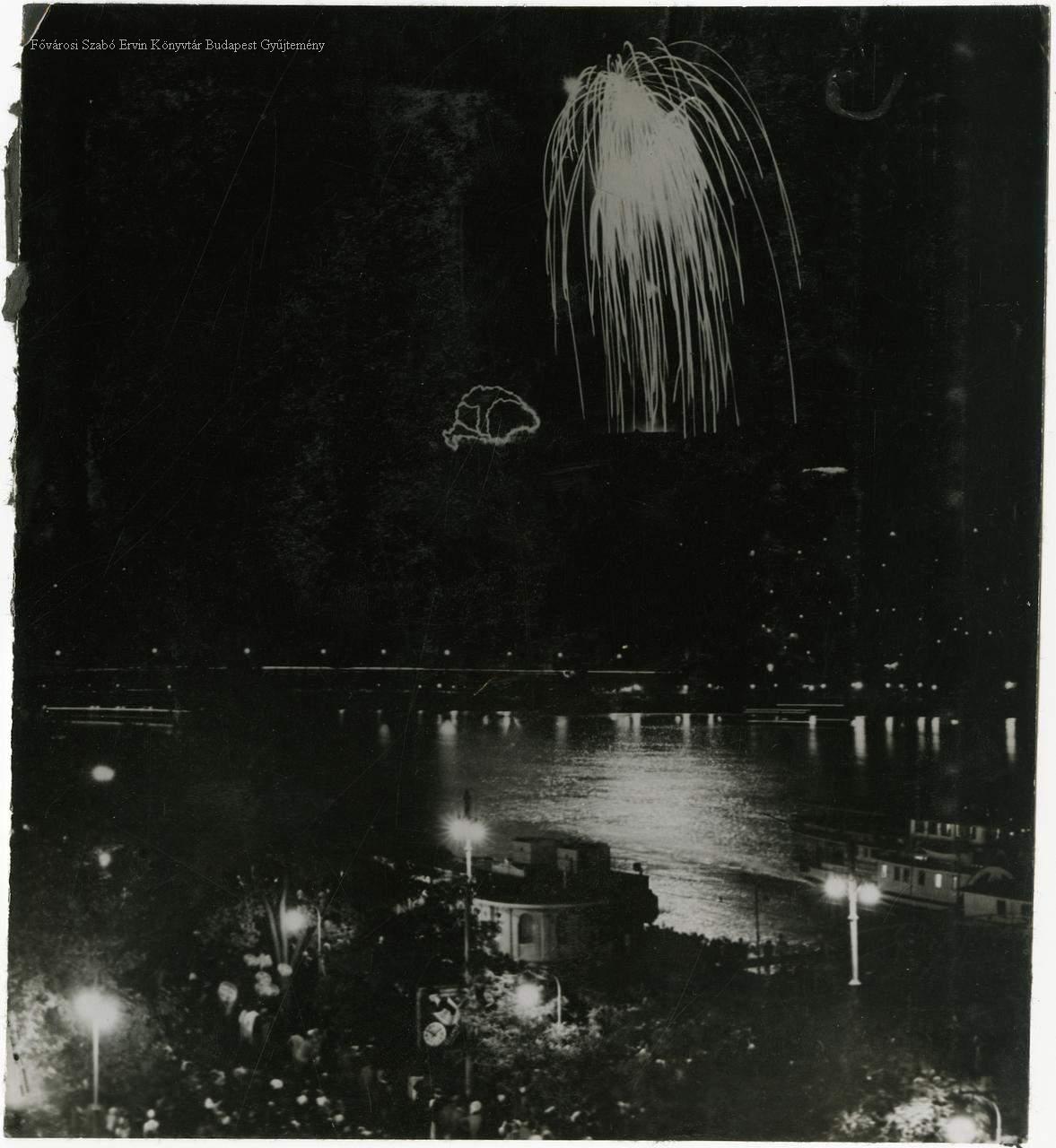 katolikus egyház, keresztény ünnep, augusztus 20., tűzijáték, pirotechnika, kivilágítás, térkép, politikai propaganda, irredentizmus, este, kikötő, hajóállomás, hajó, köztéri óra, lámpa, 1938