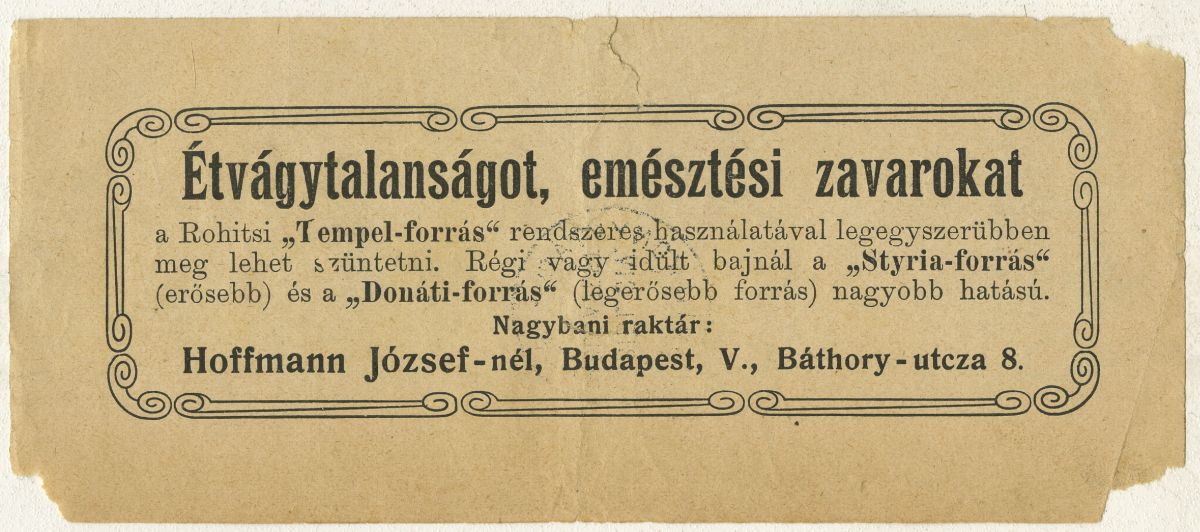étvágytalanság, étkezés, étkezési zavar, emésztés, forrásvíz, gyógyvíz, gyógyhatás, üzlet, raktár, nagykereskedelem, reklámnyomtatvány, kisnyomtatvány, aprónyomtatvány, számolócédula