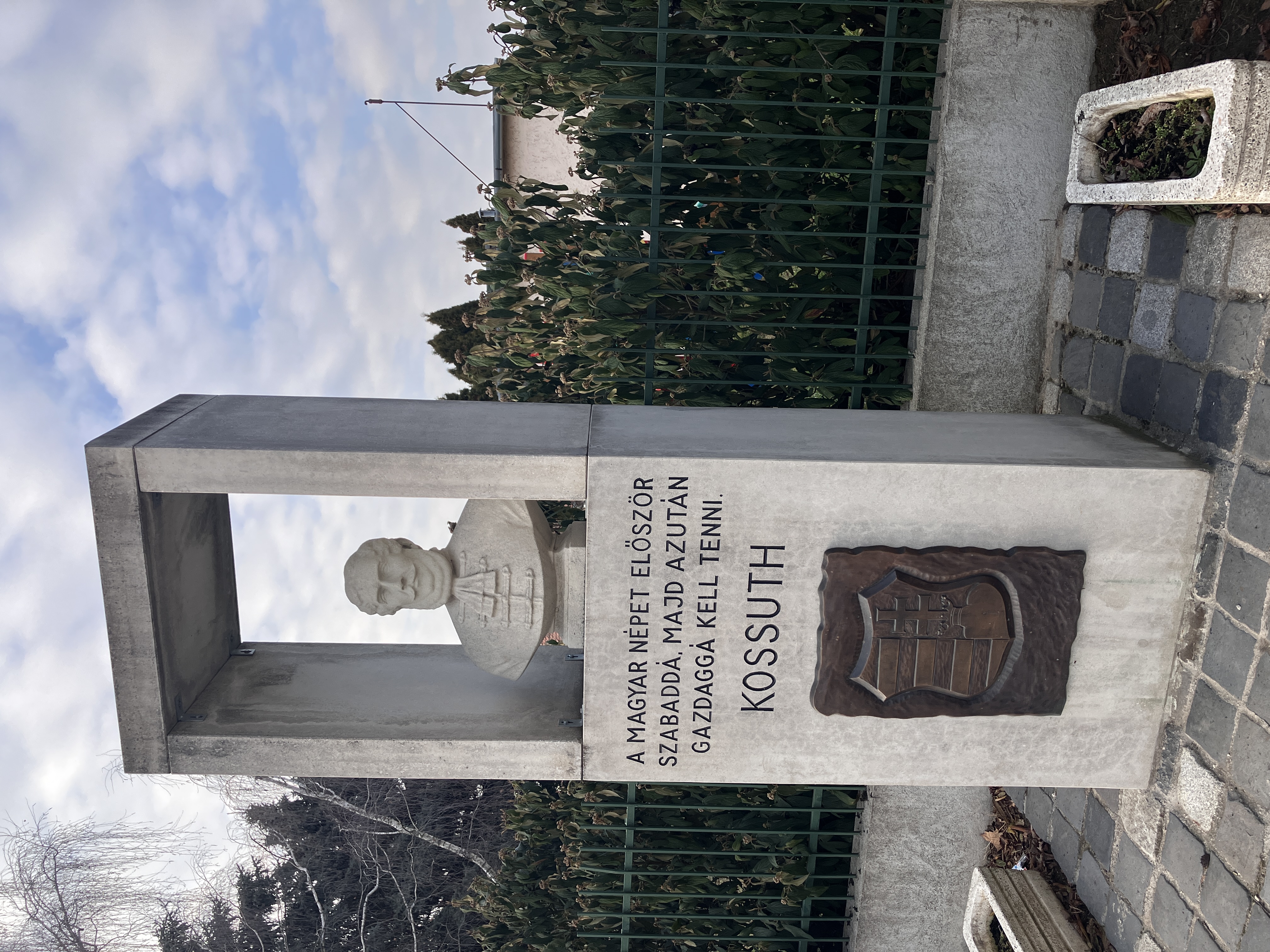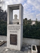 "A szobrot eredeti helyén [ti. a Csaba vezér téren] 1946. március 15-én avatták fel a rákoscsabai országzászló talapzatán. Tatár Dezső 1 nap alatt faragta ki a szobrot, ezzel a rákoscsabaiak el tudták kerülni, hogy az egykori országzászló helyére egy szovjet emlékmű kerüljön. A mellszobrot 2016. március 21-én az önkormányzat leemeltette és felújításra elszállította, hogy felújítást követően a jelenlegi, méltó helyén kerüljön felállításra. Az áthelyezés ellen aláírásgyűjtést is kezdeményeztek a helybeliek, több mint 1200-an tiltakoztak. Az áthelyezés oka pedig az volt, hogy az önkormányzat a rákoscsabai városközpont felújítása során idén [2017-ben] eredeti állapotában visszaállítja az 1936-ban emelt országzászlós emlékművet." ----- Forrás: Kossuth Lajos https://www.kozterkep.hu/30692/kossuth-lajos Utolsó letöltés dátuma: 2025.02.05. Fotó: Fodor Krisztina