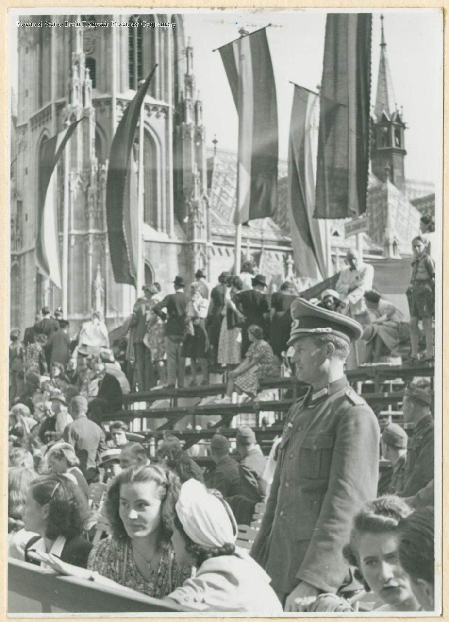 [Német katona a nézők között a tribünön Szent István napján, 1942-43-ban(?)]