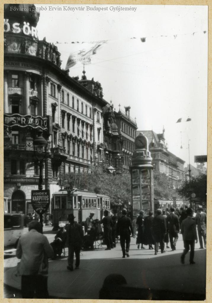 utcakép, köztéri óra, férfi, nő, villamos kocsi, hirdetés, 1934