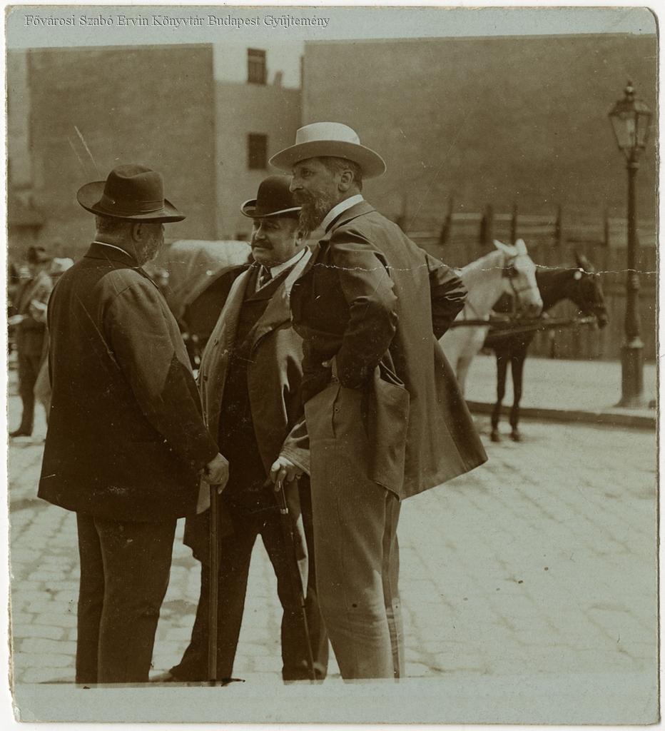 [Apponyi Albert és Kossuth Ferenc és Polónyi Géza (háttal) beszélget a Parlament előtt]