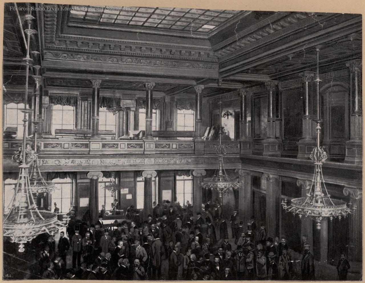 tőzsde, tőzsdei üzletkötés, kereskedelem, ember, férfi, néptömeg, csillár, épületkép, jelenetkép, belső felvétel, 1890-es évek
