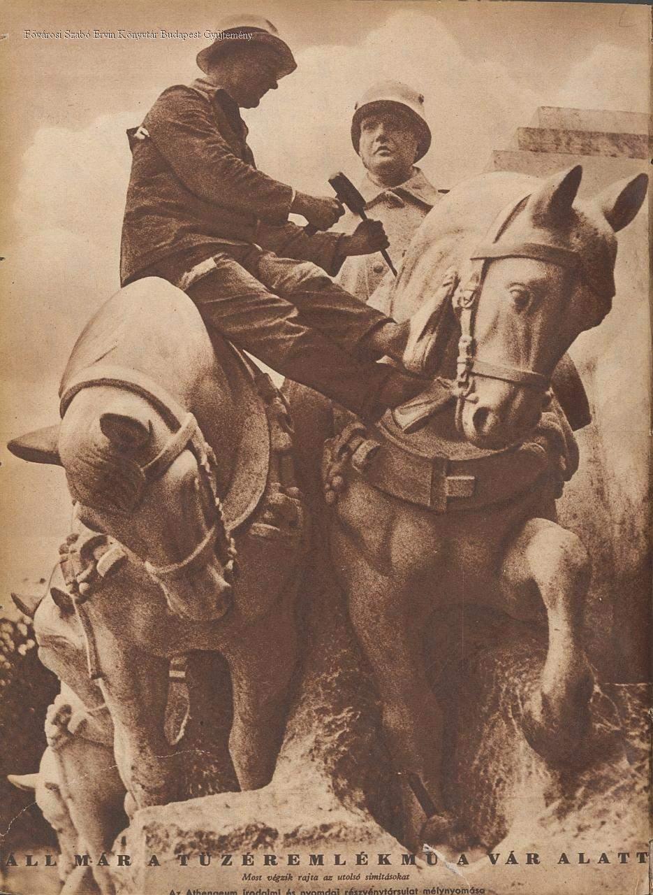 Ligeti Miklós műve, 1937-ben állították fel a Palota (ma Dózsa György) téren. A felvételen az utoló simításokat végzik az egyik lófigurán