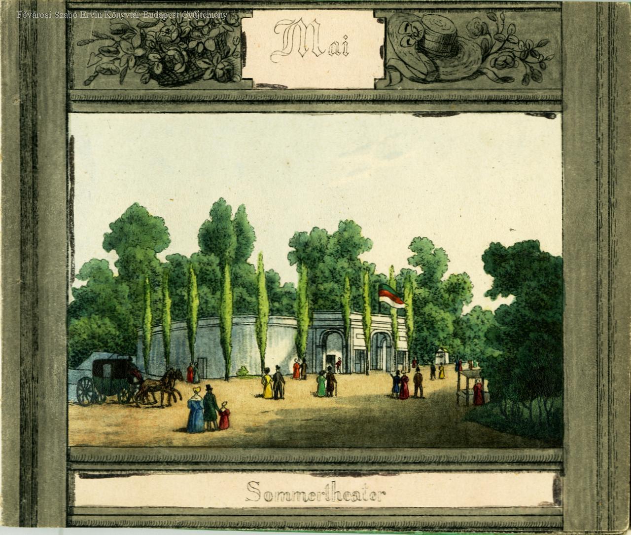 A színkör fák között, előtte sétálók. Deszkából épült nyitott körszínház volt a mai Rákóczi út és Puskin út sarkán a volt Beleznay-kertben. Megnyílt 1831-ben, lebontották 1891-ben