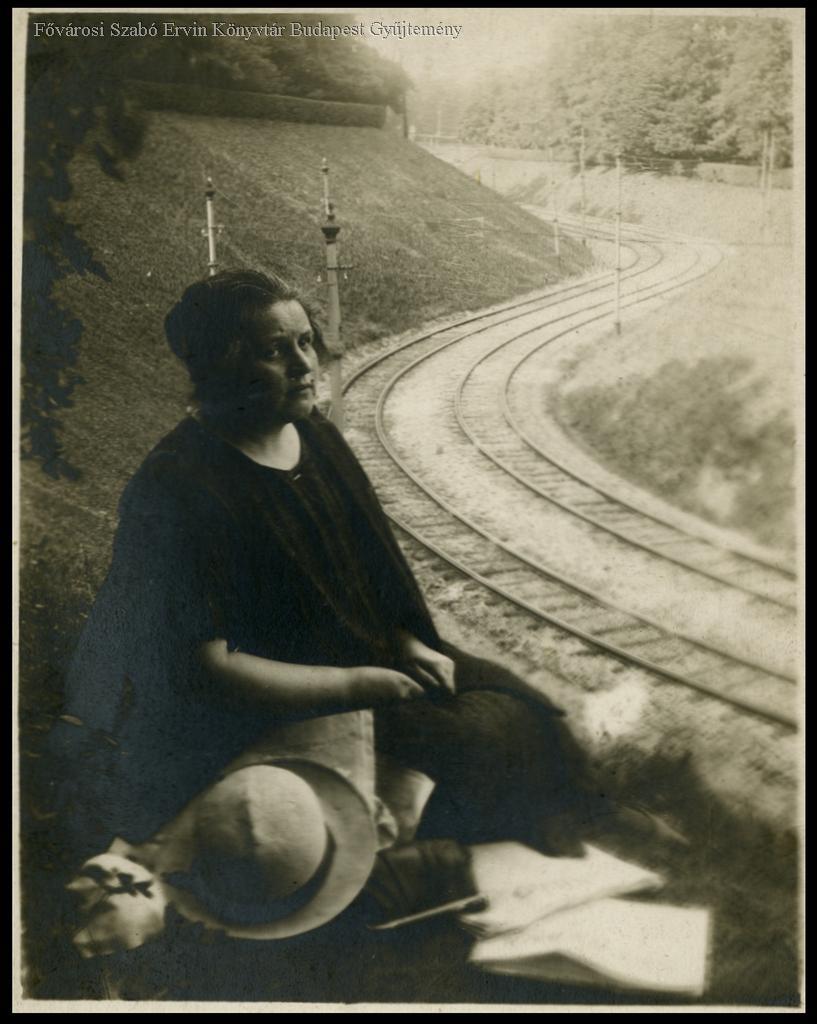 [Középkorú nő a hűvösvölgyi villamos-végállomáshoz vezető sínek melletti domboldalon]