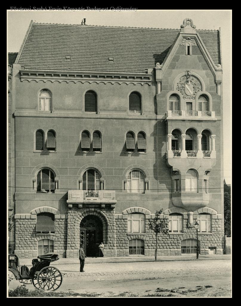 Az épület előtt kocsis vagy rendőr. Épült 1906 körül. Irod: Gerle-Kovács-Makovecz: A századforduló m. építészete. Bp. 1990. p. 48.