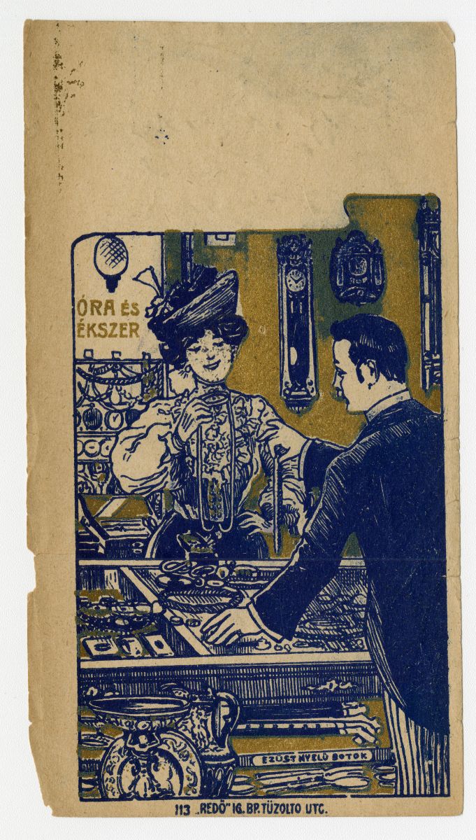 ékszer, arany, ezüst, férfi, , bot, óra, falióra, tál, lánc, órás, üzlet, eladó, vevő, vásárlás, jelenet, reklámnyomtatvány, kisnyomtatvány, aprónyomtatvány, számolócédula