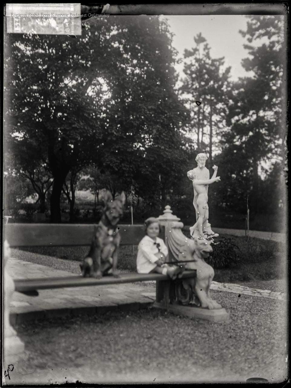 külső felvétel, lány, pad, gyermek, kutya, növényzet, fa, kert, park, szobor, életkép