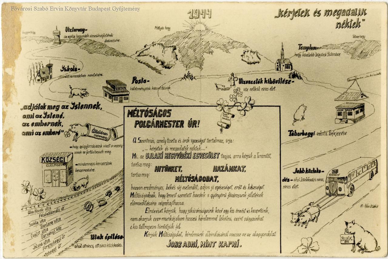 A városrész lakóinak rajzzal illusztrált kérelme, út-, iskola, közmű-, templomépítés ügyben. Egyesületi tagoknak küldött üdvözlőlap