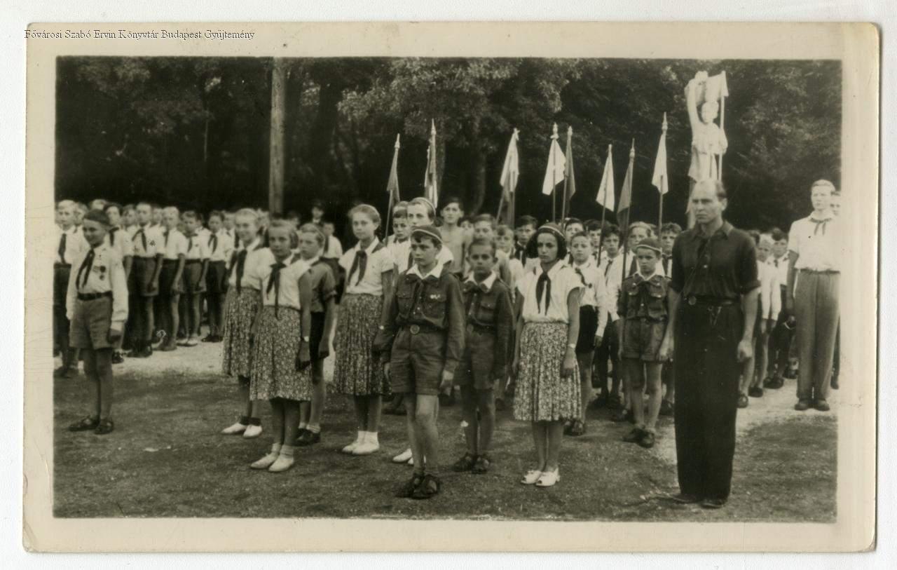 úttörőmozgalom, úttörőtábor, fiatal, zászló, egyenruha, képes levelezőlap, külső felvétel, életkép, 1950-es évek