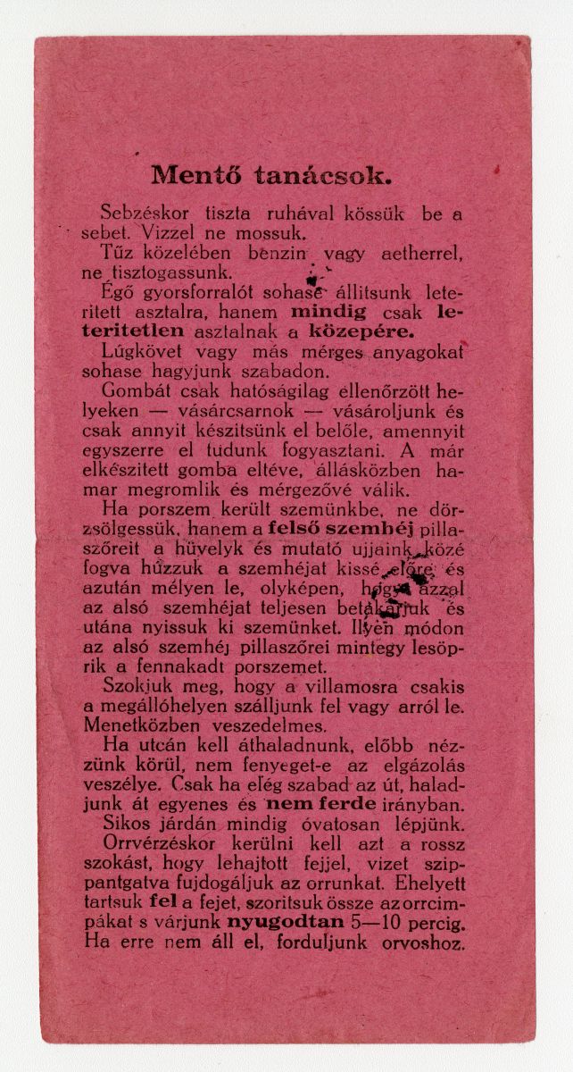tanács, táplálkozási szokás, előírás, információ, háztartás, ellátás, elsősegély, orvos, reklámnyomtatvány, kisnyomtatvány, aprónyomtatvány, számolócédula