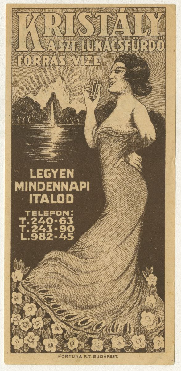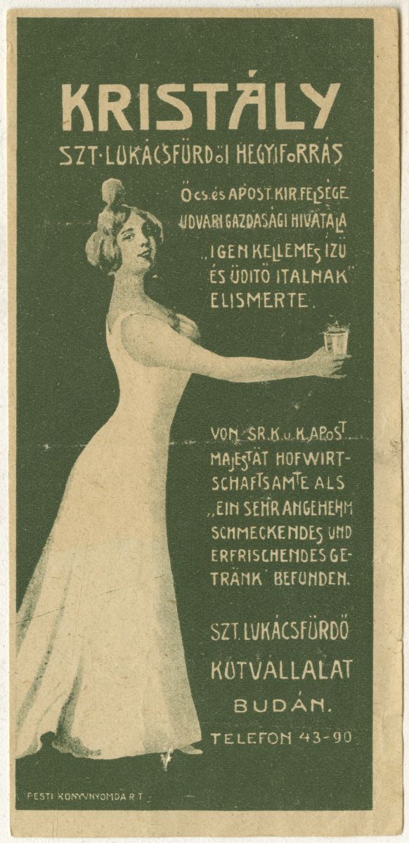 10. Kép: Szt Lukács fürdő hegyiforrás. Öcs. és apost. és kir. felsége udvari gazdasági hivatala "Igen kellemes ízű és üdítő italnak" elismert Von RS. K. u. Apos. Majästet Hofwitschaftsamte als "ein sehr Angehehm schmeckendes und erfirischendes getrank" befunden.Szt. Lukácsfürdő Kútvállalat Budán.Telefon: 43-90.
