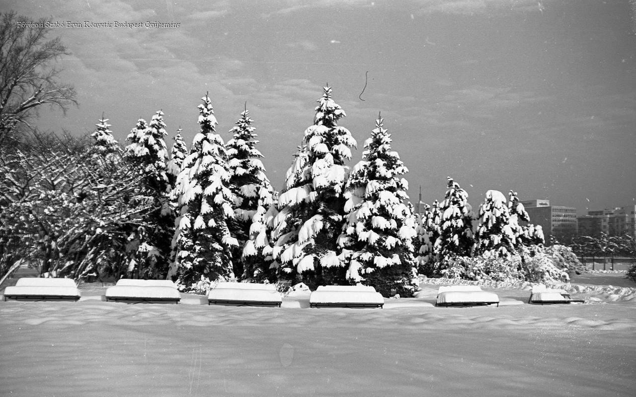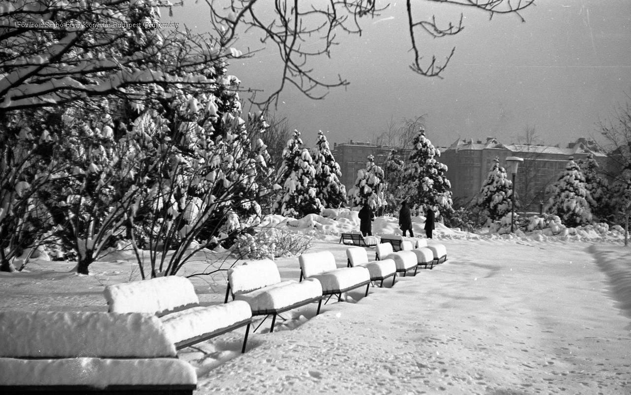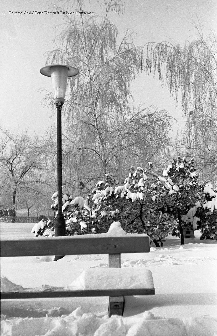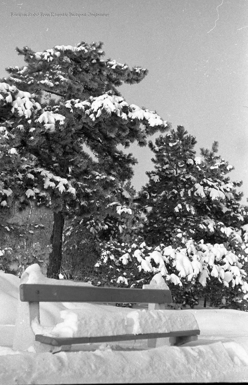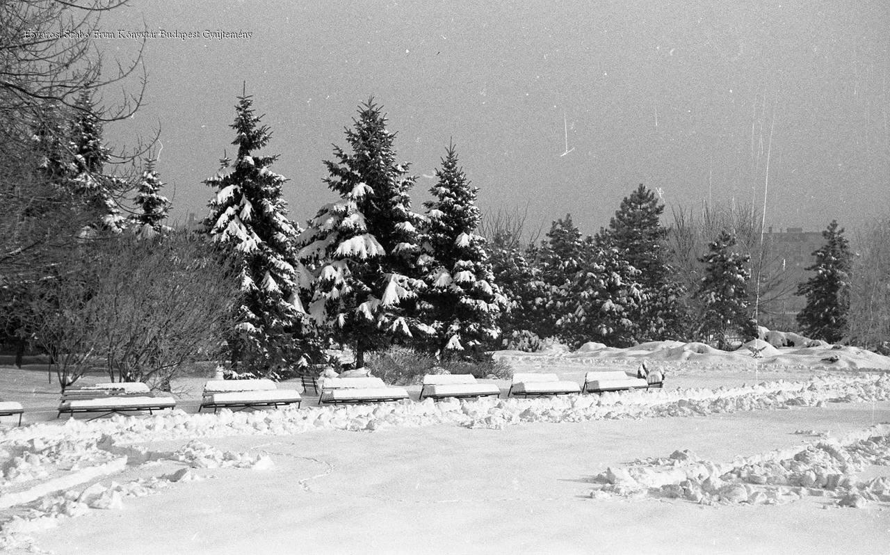 külső felvétel, sziget, park, fa, hó, tél, ember, utcabútor, ülőbútor, 1970-es évek