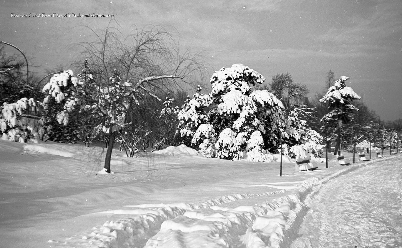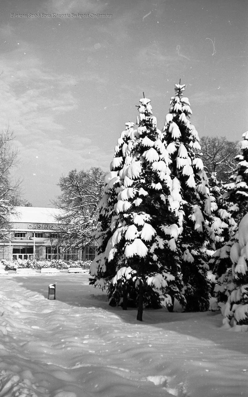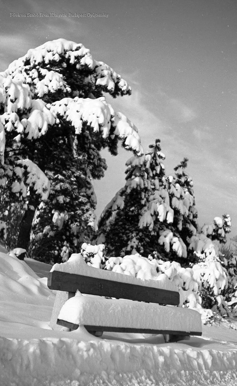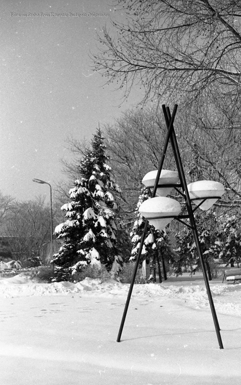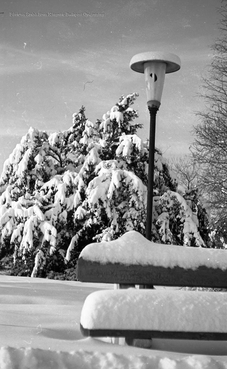külső felvétel, sziget, park, fa, hó, tél, ember, utcabútor, ülőbútor, 1970-es évek