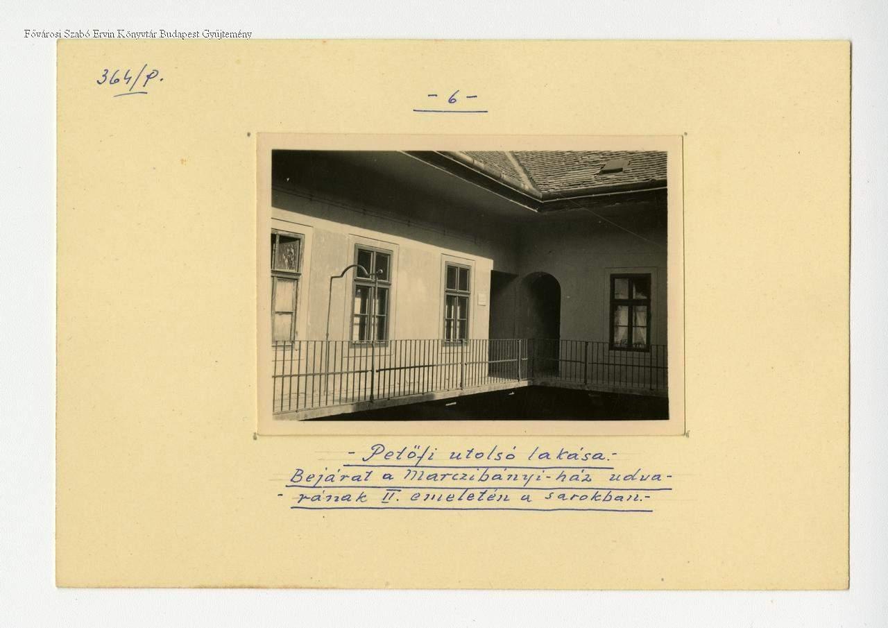 Kartonokra ragasztott, kisméretű fénykép-sorozat egyik darabja. Az amatőrfotók Petőfi utolsó pesti lakhelyét, a Rákóczi és a Síp utca sarkán egykor állott Marczibányi-házat mutattatják. 1936-ban készültek, többségük néhány héttel a ház lebontása előtt, néhány pedig a munkálatok megindulása után. Vélhetően Vasberényi Géza (1894-1981) könyvtáros, helytörténész tulajdona volt. (Esetleg ő készítette a felvételeket is?). Vasberényi Géza a húszas évektől kezdve gyűjtötte a költő emlékéhez kapcsolódó tárgyakat, dokumentumokat. Petőfi-relikviagyűjteményét haláláig dunavecsei házában őrizte, mely maga is emlékhely volt: az ifjú poéta 1844-ben ennek egyik szobájában vett kvártélyt magának. A Petőfi-kutató hagyatékát az örökösök eladták, szétszóródott. Egy részét az Ecseriről mentette meg egy magángyűjtő, 2012-ben pedig a Petőfi Irodalmi Múzeum is vásárolt néhány darabot az értékes tárgyakból.