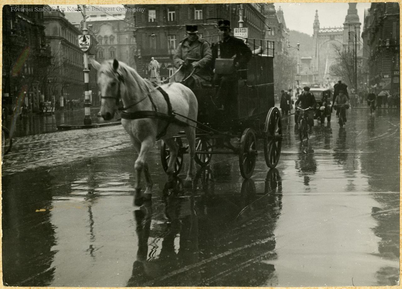 utcakép, kézbesítés, kiszállítás, postai alkalmazott, egyenruha, lovas kocsi, kerékpáros közlekedés, gépjármű közlekedés, eső, 1930-as évek