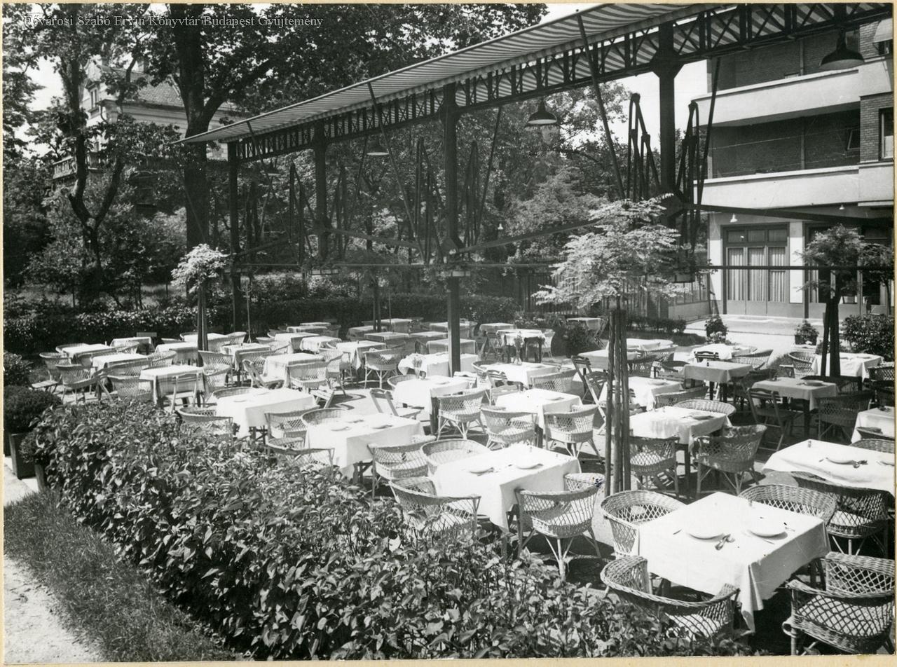 vendéglátás, étterem, park, lámpa, ülőbútor, dísznövény, nyár, külső felvétel, 1934