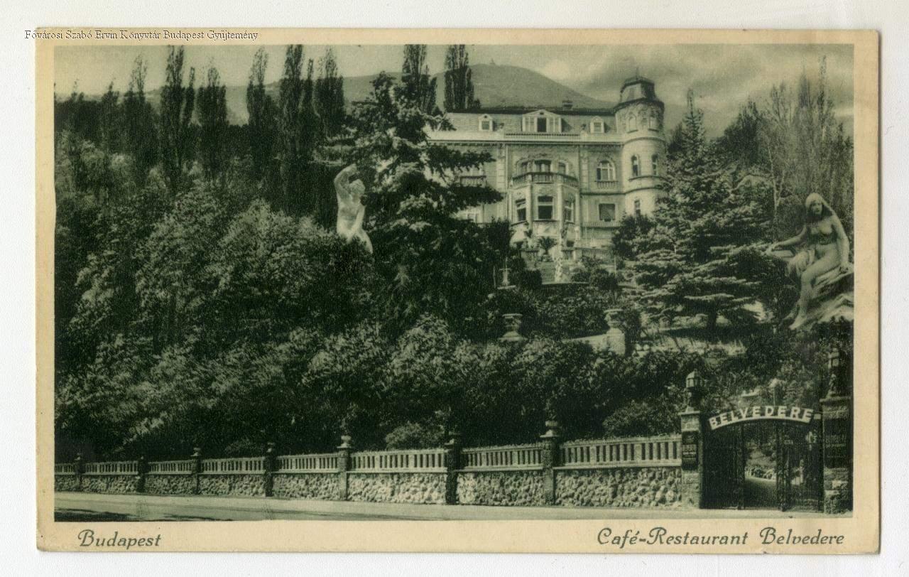 szálloda, étterem, kávéház, kapu, kerítés, fa, képes levelezőlap, külső felvétel, épületfotó, 1930-as évek