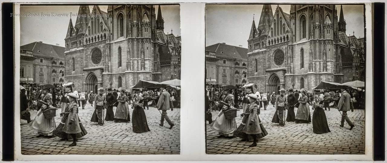 utcakép, piac, néptömeg, vásárló, épület, templom, ember, gyermek, férfi, nő, kereskedő, termék, áru, kosár, viselettörténet, öltözködés